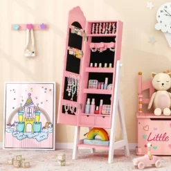 Tangkula Kids Jewelry Cabinet W/ Full-Length Mirror 2 Adjustable Tilt Angles Drawer Pink