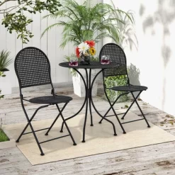 Tangkula 3 PCS Patio Bistro Set Round Table W/ 1.6″ Umbrella Hole & 2 Stools Metal Frame
