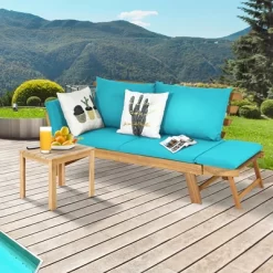 Tangkula Adjustable Patio Sofa Daybed Acacia Wood Furniture W/ Navy & Turquoise Sets Cushion