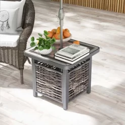 Transform your outdoor space with our chic and robust side table! This square end table is crafted with PE rattan that gives it a natural and woven look, complementing any outdoor space. The wear-resistant resin tabletop adorned with an exclusive checkerboard pattern offers a sturdy and smooth surface, ideal for placing drinks and snacks. Equipped with an umbrella hole, this outdoor side table is ready to accommodate a patio umbrella, providing shade and comfort on sunny days. Crafted with a sturdy metal frame, the square accent table offers strength and durability. Whether placed beside a lounge chair or used as a standalone piece, this side table adds convenience to your outdoor leisure time.
