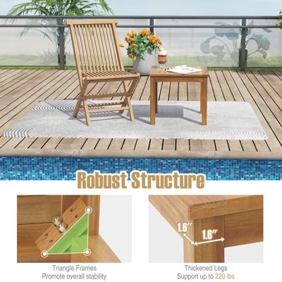 Crafted from natural teak wood, this versatile side table adds a touch of elegance to any outdoor space. Its robust structure, featuring triangle frames and sturdy legs, can support up to 220 lbs. Suitable for indoor and outdoor use, it serves as a side table, snack station for the poolside area, or nightstand for your bedroom. The painted surface is easy to maintain, requiring minimal upkeep for long-lasting beauty. With simple assembly, just secure the 4 legs, this end table effortlessly enhances your outdoor area. The outdoor side table will be an ideal addition to your outdoor furniture.