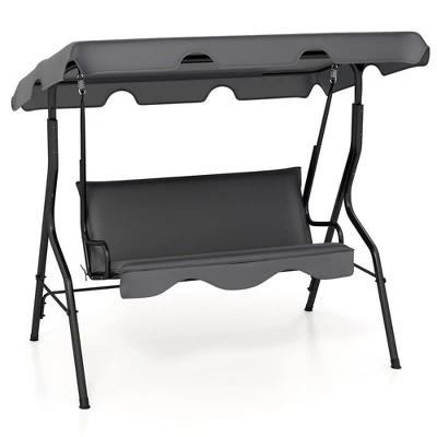 Enjoy serene moments with our 3-seat porch swing seat, designed to comfortably accommodate 2 adults and 1 child.This outdoor swing features a spacious seat with a removable cushion, tilted backrest, and ergonomic armrests, so comfort is at the forefront of its design. Moreover, the adjustable canopy shields you from the sun, while the sturdy A-shaped metal structure and anti-slip foot pads ensure stability and safety. The canopy’s polyester fabric is sun-proof and waterproof, making the swing chair a lasting addition to any outdoor space, such as a garden, backyard, porch and so on. Enjoy leisure time with your family!