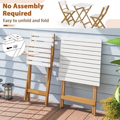 Made of acacia wood with a PU coating, this patio bistro table and chairs set combines stunning aesthetics with durability. The foldable bistro table features a large tabletop, providing ample space for your outdoor essentials. Each patio dining chair is designed with a curved backrest for enhanced comfort. The foldable, lightweight design makes it easy to move and store, perfect for your patio, backyard, or poolside. Designed for stability, the folding outdoor furniture set incorporates stable X-shaped structures and reinforced crossbars, creating an ideal spot for relaxing leisure times for you and the one you love.