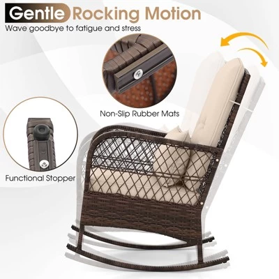 This rocking set includes 2 gently rocking chairs with non-slip rubber mats and stoppers for safety, and a double-tier coffee table with a tempered glass tabletop for durability and style. The rattan surface of the 3 pieces brings more elegance. Moreover, the comfortable cushions filled with high-density sponge offer you endless coziness. Elevate your patio or garden with this elegant wicker rocking set and turn your outdoor space into a serene retreat.