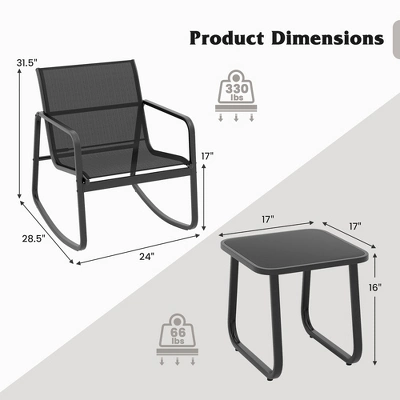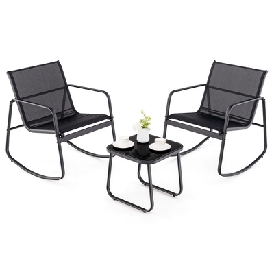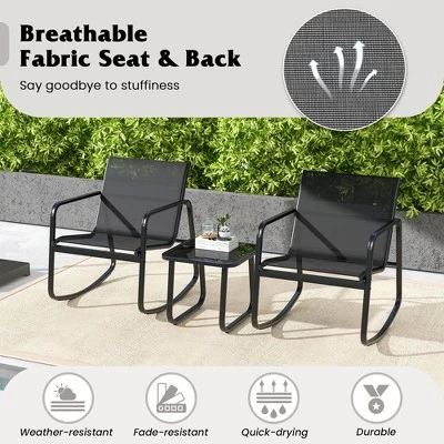 The 3 piece rocking bistro set is the perfect addition to any outdoor space!This outdoor conversation set includes 2 rocking chairs and 1 glass-top coffee table, providing a comfortable and stylish seating arrangement. The rocking chairs are designed for maximum comfort, with ergonomic curves and smooth rocking motion. Breathable fabric material is weather-resistant, quick-drying, fade-resistant and long-lasting. Apart from that, the glass-top coffee table is not only functional but also easy to clean. Whether you want to chat with friends, enjoy a cup of coffee, or simply unwind after a long day, this 3-piece rocking bistro set provides the perfect setting.