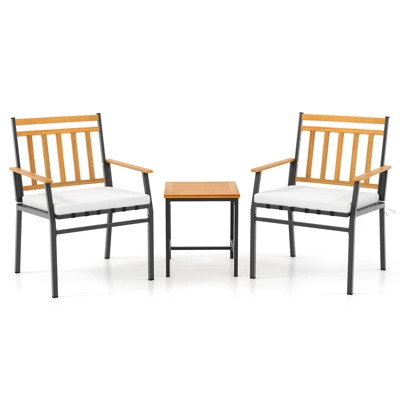 The solid acacia wood and sturdy metal frame not only make this patio furniture set long-lasting and stable but also add a rustic yet modern addition to your outdoors. Additionally, the ergonomic patio chairs feature soft cushions to provide you with a comfortable seating experience. Whether placed on a cozy balcony, a chic porch, or in a blossoming garden, its compact design and classic aesthetic ensure this outdoor conversation set integrates seamlessly while elevating the surroundings.