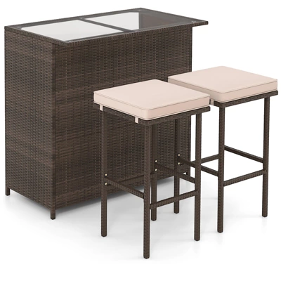Cheers to comfort, style and endless summer nights with our 3-piece PE rattan patio bar set.Crafted with hand-woven PE wicker and featuring a sleek tempered glass tabletop, this outdoor bar set promises both resilience and a modern aesthetic. Moreover, this patio bar table and chairs set perfectly balances style and functionality, including a 39″ bar table matched ideally with 28″ stools, all enhanced by conveniently placed 12.5″ and 11″ footrests for peak comfort. Built-in storage shelves under the table ensure essentials are within easy reach, while removable cushions on each stool promise easy maintenance and cozy seating.