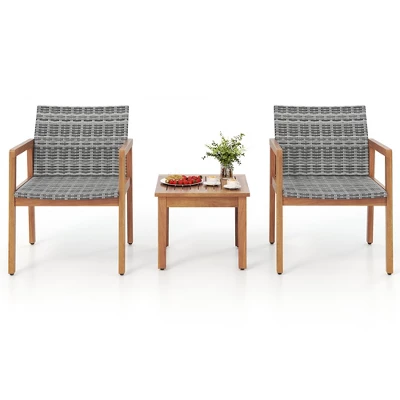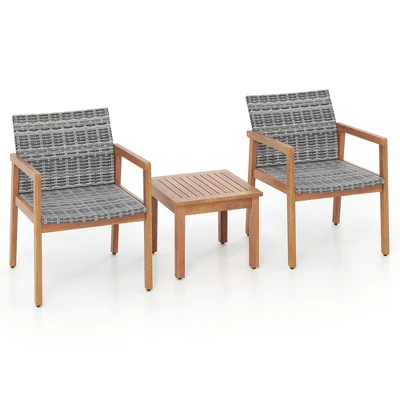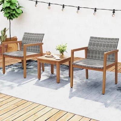 Enjoy the beauty of the outdoors with our 3 pieces patio furniture set!Crafted from natural acacia wood and hand-woven PE rattan, this outdoor furniture set not only adds an elegant touch but also ensures long-lasting performance. The practical coffee table provides a perfect storage solution for drinks and other items. With a comfortable backrest and armrests, this patio conversation set is ideal for outdoor relaxation. The adjustable foot pads allow this 3 pieces patio bistro set to remain stable on uneven surfaces. With its modern appearance, this outdoor conversation set is a fantastic addition to any balcony, garden, or poolside area.