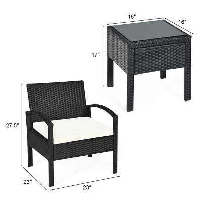 Are you looking for a set of outdoor conversation set which can be put in your garden or other home area so that you can enjoy a wonderful outdoor leisure time with family or friends? Our patio rattan furniture set is one of the best options. This set includes a table with tempered glass top and 2 rattan chairs with cushions. High quality steel frame and PE rattan ensures stability and durability. The cushions on the chairs are thick and soft, so you can have a comfortable sitting experience. Most important, the weight capacity of each chair is 350 lbs which will meet demands of most people. Please do not hesitate to buy it!