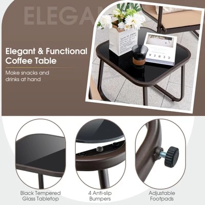 This 3-piece metal conversation set provides a perfect spot for outdoor relaxation. The ergonomic seating with breathable fabric ensures comfort and prevents overheating. The heavy-duty metal frame guarantees stability, while adjustable footpads minimize wobbling for added security. The compact coffee table is both functional and convenient for placing drinks or snacks, with a tempered glass top that is easy to maintain. This patio furniture set will enhance your backyard, poolside, or balcony space.