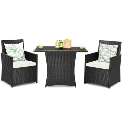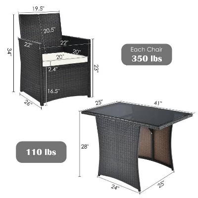 - 【3 PCS Patio Bistro Set】 Including a practical coffee table and 2 armchairs, this 3-piece patio dining set creates a comfy area for your morning coffee or dinner time with the one you loved. The convenient coffee table with spacious tabletop allows you to place different items, from magazines and ornaments to drinks and snacks.