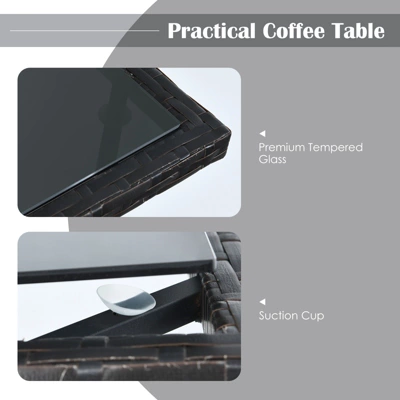 Make your life more comfortable with this 3PCS patio rattan. Soft breathable seat cushions, proper armrest height, and curved backrest make for a more comfortable user experience. And our cushion covers are detachable and easy to clean. The tempered glass on the coffee table is insulated and easy to clean, even if drinks are spilled on it. The space-saving design allows you to place unused chairs under your desk, making them more suitable for small Spaces. Made from high-quality PE rattan and sturdy metal, the furniture set is weather-resistant and lasts longer, perfect for patios, gardens, backyards and poolsides.