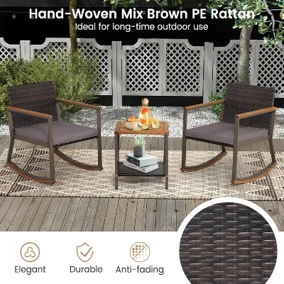 Experience the outdoor oasis you’ve always dreamed of with our 3-piece rocking bistro set! This set includes 2 rocking chairs, 2 seat cushions, and 1 coffee table, making it a perfect addition to both indoor and outdoor settings. The rocking chairs, with soft cushions, provide a smooth rocking motion that will help you relax and unwind. The coffee table features an extra storage shelf for convenient placement of items. Constructed with a sturdy metal frame, long-lasting PE rattan, and natural acacia wood, this outdoor furniture set guarantees a long service life. Whether placed on your porch, poolside, or balcony, this set is perfect for enjoying morning coffee and pleasant conversations with friends and family.