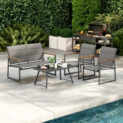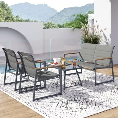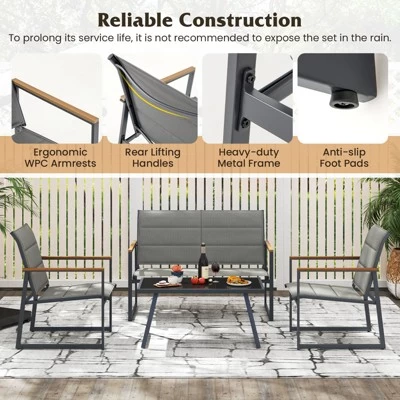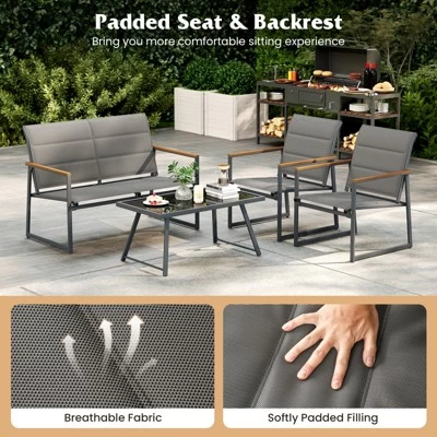 Upgrade your outdoor space with this patio furniture set!This 4-piece outdoor conversation set includes 1 loveseat, 2 single chairs, and 1 coffee table, which can be freely arranged to fit different settings. To provide you with upgraded comfort, these loveseat and armchairs are ergonomically designed with high backrests, wood-plastic armrests and wide seats. Likewise, the padded fabric is breathable and quick-drying, so you won’t feel hot during long-time sitting in summer. Constructed of heavy-duty metal frame, the 4pcs sofa set is sturdy and strong to support heavy loads. Whether used in backyard, garden, porch or poolside, this outdoor furniture set will be a nice addition.