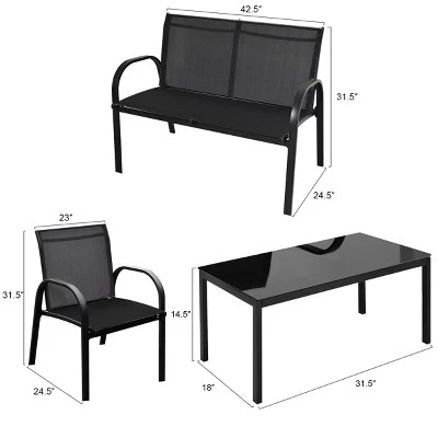 This is our brand new 4 PCS furniture, including 1 loveseat ,2 single armchair and 1 tea table. It is sturdy and durable since it’s made of steel frame. Also the modern structure and classic black color look very stylish. The table with a piece of glass is useful for putting your cups, fruit and any other things. It’s easy to clean the table. Don’t be hesitant,Buy it today!