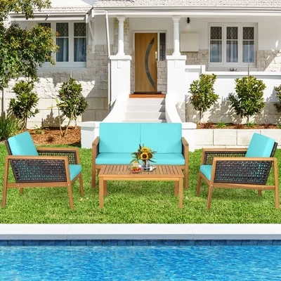 Put this 4-piece outdoor acacia wood furniture set in your backyard to listen to the sounds and enjoy the beauty of nature! There are various combinations for this outdoor sofa set that allows you to freely rearrange based on the size of your space. Therefore, it is not only suitable for courtyard, but also will fit for other outdoor places. Considering the changing weather, this patio furniture set is constructed of solid acacia wood and all-weather PE rattan. What’s more, the loveseat and chairs are equipped with soft padded cushions as well as ergonomic armrests for comfy sitting experience. And the large coffee table accommodates different items easily.