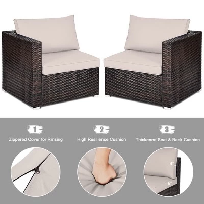 To have a pleasant leisure time outdoors with our wicker corner sofa set. This corner sofa set is stylish and long-lasting thanks to the PE rattan and tough steel frame. Two of them can be used separately or matched with other furniture in your outdoor space. The armrest of sofa is wide for resting your hand and arm comfortably. With thick and soft seat and back cushion, the sofa set will add more comfort to you. And the detachable design with zipper can bring you convenience for cleaning the cushion easily. Plus, the anti-slip aluminum foot pads ensure the stability of the sofa even in wet weather and can protect the floor from scratching.