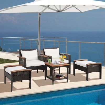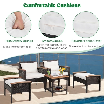 This 5-piece patio rattan set will create a perfect outdoor relaxing space for you.Coming with 2 single chairs,2 ottomans,a 2-tier side table,2 back cushions,2 seat cushions and 2 ottoman cushions,this rattan sofa set will bring endless comfort to you. The curved armrests and backrests will effectively relieve your fatigue and stress. And the ottoman can not only be used to relax your feet,but also provide additional seats. Both the ottoman and single chairs are equipped with cushions for higher level of comfort. And the zippers of seat cushions and ottoman cushions make maintenance much easier.