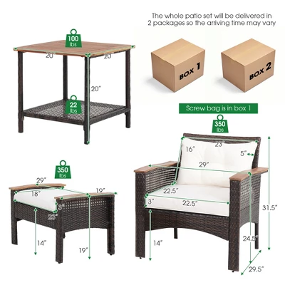 Including 2 single chairs with seat and back cushions,2 ottomans with cushions and a 2-tier side table