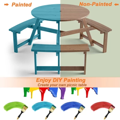 Our picnic table set with a large and 3 benches measures 65″ x 28″ (Dia. x H) and can hold up to 6 persons, which is perfect for enjoying delicious meals, afternoon teas, or snacks in the company of your family or friends. It is made of 100% natural fir wood with varnish paint, which is long-lasting and weather-resistant, ensuring long-term outdoor use. And the triangular structure provides strong support and ensures excellent stability. The tabletop loads up to 220 lbs and each bench 330 lbs. Other than that, the dining table is designed with a built-in umbrella hole (diameter: 1.5″), bringing convenience for inserting an outdoor umbrella and enjoying a shady outdoor area. You can also paint it with different colors and beautiful patterns to customize a unique dining table. Whether holding backyard parties, enjoying picnics, having BBQ, or chatting with your friends or family, our outdoor dining table can be a perfect choice!