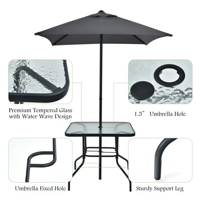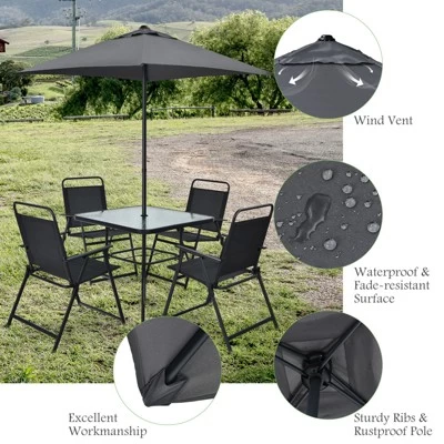 Take advantage of the nice weather and eat your meals on the patio on this stylish 6-piece patio garden table set with umbrella. Made with heavy-duty rust-resistant and weather-resistant steel frame, this dining set is produced with high-performance powder coating, protecting it from rust, scratches and harmful UV rays. High quality polyester fabric is soft to the touch, dries quickly, and resists fading. Equipped with an umbrella, the patio dining set can be placed in outdoors, such as patio, backyard, poolside and garden. Our stylish and simple dining set can instantly transform your backyard into a picturesque setting for meals.