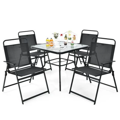 - Comes wit 4 dining chairs, 1 folding table and 1 umbrella