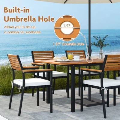 Are you looking for a versatile patio dining set that enhances your outdoor space? This premium 7-piece set includes a rectangular table and 6 armchairs, made from natural acacia wood that’s easy to maintain. The expandable tabletop (51″-64″) is easy to control, pull away the table panels towards the side, place extension board and push inward to merge. The table also comes with a built-in umbrella hole (1.97″) for sun protection. Besides, the chairs can be stored under the table or stacked, saving space when not in use, and the high-density sponge cushions with a tilt slat backrest provide comfort and a cooling experience.