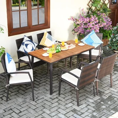 Including 1 rectangular acacia top table and 6 rattan chairs, our 7pcs dining table set can provide ample space for holding a party or having meals with your family and friends. Constructed from a sturdy steel frame and wear resistant PE rattan, this dining set is stable and durable enough to support long lasting use. Besides, with soft seat cushions and ergonomic backrests, the chairs can provide you with a comfortable sitting experience. And an umbrella hole is included for holding an umbrella which can block the glare of the sun. Moreover, the stylish and simple design is perfect for your garden, yard, balcony and so on. With this dining table set, you will enjoy a happy outdoor dining time with your family or friends.