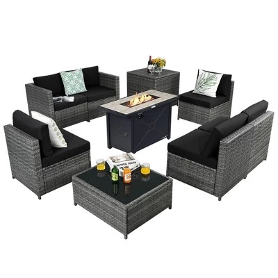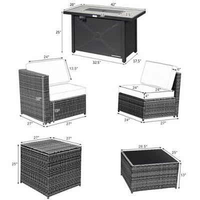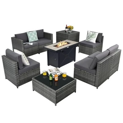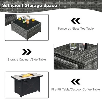 Are you looking for a portable furniture set that suitable for various outdoor activities? The patio furniture set with 42″ fire pit table is perfect for family gatherings and bonfires. It is made of powder-coated steel frame and durable PE rattan for long-term use. With heat output 60,000 BTU,this fire pit table provides soothing warmth and gentle lighting for you. The Storage box,coffee table and fire pit table are designed for multiple use. Each component of this sofa set can be used individually or in combination based on your need for garden,backyard or patio.