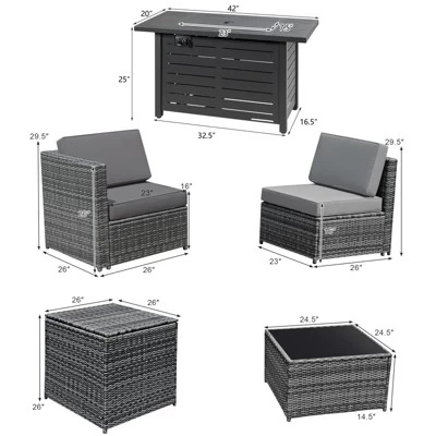 Our rattan sofa set with 60,000 BTU fire pit is suitable for both indoor and outdoor use. Rattan design is stylish to be a great decoration in your garden or yard. At the same time, it’s easy to clean and need no special maintenance. Steel frame is durable and sturdy enough to have 2240 lbs load-bearing capacity in total. This sofa set comes with a storage box and a coffee table to store and place items. The matching cushions are soft and comfortable. With detachable covers, it’s convenient to clean. Besides, sofas can be combined in different ways according to your idea. The outdoor fire table is made of sturdy steel material for durability and stability. Coming with a waterproof PVC cover, the table surface will not easy to be damaged and can stand the test of time. And complete with a high-efficiency burner, you can enjoy all the pleasures of a warm fire without worrying about messy ashes. You can have a party or gather with family members even in cold winter evening.