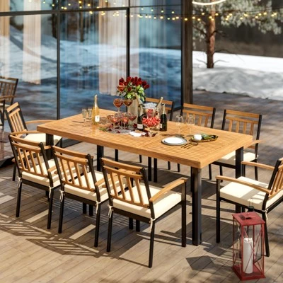 Enjoy outdoor dining in style with this 79″ acacia wood dining table. Designed to comfortably seat up to 8 people, the spacious rectangular tabletop provides ample space for family meals, dinner parties, and outdoor gatherings. Crafted from acacia wood, the splinter-free surface showcases a rich natural grain that adds timeless beauty to any setting. Supported by metal legs and adjustable foot pads, this 8-person patio dining table offers exceptional stability. The built-in umbrella hole allows you to easily add shade to outdoor dining area, while the included matching cover keeps the tabletop neat when not in use. Perfect for your backyard, garden, patio, or dining room, this versatile table seamlessly blends elegance and functionality.
