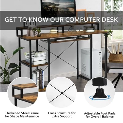 The 47 inch computer desk uses elaborately retro style design, aiming to bring you pleasant visual enjoyment and an efficient office experience. It is designed with a 5″ monitor stand, winning the advantage of providing you with a comfortable viewing angle and relieving your neck fatigue. What’s more, the spacious tabletop and large storage space also cater to your daily working needs. And high-quality engineered wood boards and thickened steel pipes will ensure high sturdiness for longer life span.