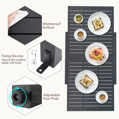 Enhance your outdoor dining experience with this extendable patio dining table.With an ability to expand from 31.5″ to 63″, the outdoor rectangular table caters comfortably to gatherings of 4-6 people. What’s more, featuring an all-weather aluminum frame, this dining table is built to last through diverse weather conditions, ensuring continued use season after season. It’s also worth mentioning that the adjustable foot pads and sturdy fixing devices ensure a level and secure setup, making the aluminum outdoor table the ideal centerpiece for your lawn, backyard, garden, or deck dining area.