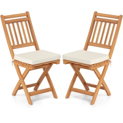 Unfold comfort, embrace nature with our folding patio chairs set of 2!Crafted from sturdy acacia wood, these patio dining chairs combine lasting resilience with visual appeal. The comfort level is improved with sponge-filled seat cushions, featuring removable covers for convenient cleaning. It is easy to move and store the acacia wood outdoor chairs thanks to their foldable and lightweight design. The stable X-shaped structures and reinforced crossbars provide reliable support, and each chair accommodates up to 400 lbs. Designed for various outdoor settings, these patio folding chairs offer a hassle-free way to relax in your patio, garden, or poolside area.