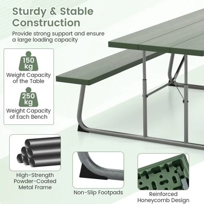 A Versatile and Convenient Outdoor Seating Solution for All Your Gatherings!Our folding picnic table set includes a rectangular table and 2 benches. The table measures 72″ x 29″ x 29″ (L x W x H), and the bench measures 72″ x 11.5″ x 18″ (L x W x H), which can comfortably accommodate up to 8 people. In contrast to other wooden tables or metal tables, our HDPE tabletop is fade-resistant, weather-resistant, crack-resistant, and ultraviolet-resistant, lasting for years to come. And the heavy-duty powder-coated metal frame ensures good sturdiness and stability. More than that, this table set can be easily folded and stored away, saving valuable space when not in use.