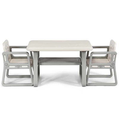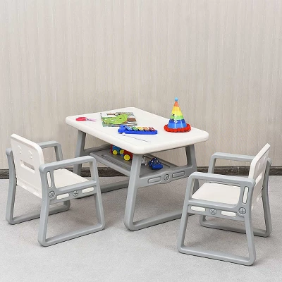 This is our brand new activity table and 2 chairs set, which is the perfect size for kids to enjoy food, read books, make crafts or just play board games. Our set includes a spacious table and two comfortable chairs for children. So you do not need to buy another chair any more. There is a storage shelf below the table, which enhances the extra storage spaces for your child to organize their pen, books, toys or other sundries. Made of environmental-friendly and non-toxic HDPE material, this set is harmless and odor-free for children use. So you can place it in the living room, kids room, playing room or class room. Do not worry about the safety, because the smooth and rounded surface will not hurt your kids. We upgrade every details to build the most reliable table and chair set for your baby!
