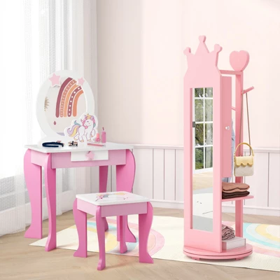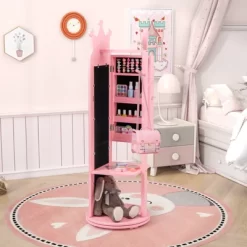 Delight your little princess with our jewelry armoire cabinet!The top crown shape will appeal to your child. The clear full-length mirror brings your little one a head-to-toe view. It also has 33 ring slots, 3 storage shelves, 2 hooks, and 2 bottom shelves. Kids can store their jewelry, nail polishes, clothes, and toys according to their daily needs. 360° swivel base makes it easy to rotate. To keep it safe and sturdy, the standing jewelry cabinet also has an anti-toppling device and stable legs.