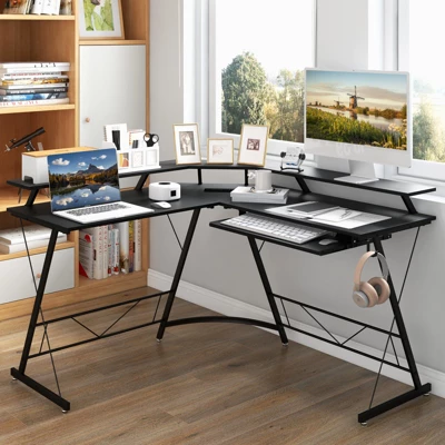 - Spacious L-shaped Work Area: With its spacious L-shaped tabletop, the computer desk adopts a fully open design to provide ample storage space for computers, books, keyboards, cup, potted plants, lamp, etc. Besides, l-shaped raised monitor stand with ergonomic design can allow you to head up to protect the cervical spine and keep a right sitting posture.