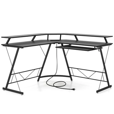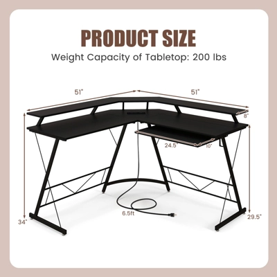 Our L-shaped home office desk is designed to offer a spacious and efficient workspace for your home office. It features a large L-shaped tabletop to help you organize files, stationery, and personal items. With convenient monitor stands, it promotes better posture and reduces strain on your neck and shoulders. Equipped with a reversible keyboard tray to be installed on either side of the desk, you can configure it to suit your space and preferences. Featuring power outlet and USB ports, this desk makes it easy for you to stay connected and charge your devices. This computer desk offers the perfect blend of functionality and style, making it an ideal addition to any home office. Transform your workspace and enhance your productivity today.
