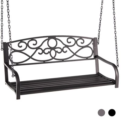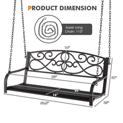 Create a beautiful sitting area to enjoy the beautiful weather with your beloved ones by relaxing on this porch swing bench! Made of high quality metal frame with powder-coated surface, this hanging swing porch is rustproof and durable enough to stand the test of time. Plus, 2 sturdy hanging chains are evenly stressed and hold the entire bench firmly. With ergonomic backrest and armrests, the hanging swing allows you to sit comfortably while relaxing on it. The unique patterns and stylish appearance make the swing bench suitable for backyard, porch, deck, garden and so on.