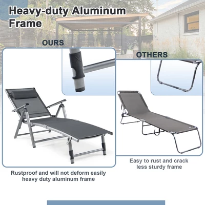 - Lightweight Aluminum Pipes & Anti-Slip Footpads: The fabric of seat and back is also rip-resistant and wear resistant. Plus, the main frame of the chaise lounge chair is constructed of lightweight aluminum pipes, which is not only as sturdy as steel, but also more lightweight than steel. Furthermore, the aluminum features premium rust resistance for long-time use. And the anti-slip footpads well protect the ground from scratches.
