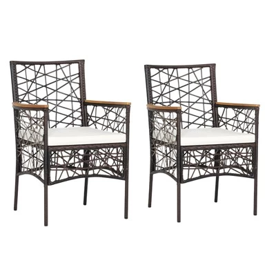In order to make the patio dining chairs last for long time, we selected all-weather and durable PE rattan as well as the coated rustproof steel frame for you. Thanks to the anti-slip foot pads, the outdoor patio chairs set is stable enough and will not scratch the floor. An enjoyable sitting experience is accessible because of the thick and soft cushions, which covers are detachable for easy cleaning. With wide backrest and seat, the PE wicker chairs have an ergonomic design. You are able to rest your hands on the curved acacia wood armrests for comfort. Because of the elegant appearance, the PE rattan conversation set fit for a variety of places.