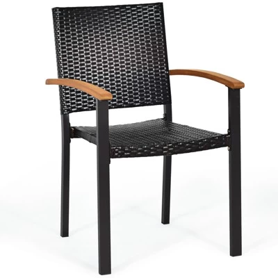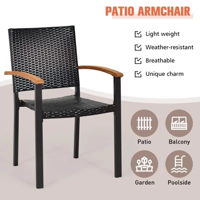 This patio dining armchair set features a rustic wicker style, offering you a comfortable seating experience. These dining chairs are of a simple but versatile design which makes them perfect for home, restaurant, or bars. They apply sturdy and rust-proof powder-coated steel as a frame, solid acacia wood as an armrest top, and wicker weaved edging, guaranteeing long-term use. The ergonomic armrest, back, and seat base are designed to bring you comfort so that you can continue to sit for a long time without feeling tired. You can sit on the leisure chair to enjoy meals, drink at a bar, or for guests in a holiday gathering.
