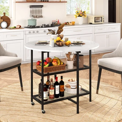 A Versatile and Space-Saving Dining Solution for Your Living Space!Our folding dining table measures 40″ x 32″ (Dia. x H) and features 2 drop leaf panels, allowing you to effortlessly transform it into a compact size ideal for small rooms or apartments. And it is designed with 2 open shelves to keep your essentials organized and within easy reach. Beyond dining, this table can also transform into a work station or sofa side table, catering to different lifestyles. Moreover, it is constructed from sturdy metal tubes, providing strong support, not easy to deform. And there are 4 adjustable footpads for enhanced stability.