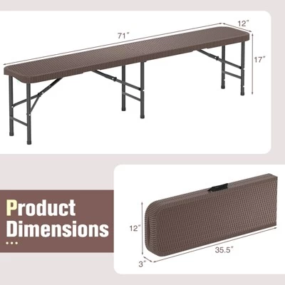 Make outdoor events a breeze with our 6 ft premium HDPE folding bench. This bench is designed for convenience and comfort, perfect for any outdoor gathering. The 1.58″ thickened seat is crafted from premium HDPE, making it sunproof, waterproof, and resistant to fading, ensuring durability for long-term outdoor use. The bench features a stylish rattan texture for added appeal. With sturdy metal legs and a secure locking mechanism, this bench offers strong support for up to 1320 lbs. The fold-in-half design allows for easy storage and portability, making it ideal for picnics, camping, poolside lounging, or competitions. This bench can comfortably seat up to 4 people, providing a relaxed atmosphere for you and your friends to enjoy outdoor activities.