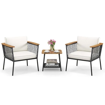 Experience outdoor living at its peak with this 3-piece patio furniture set, seamlessly blending luxury and functionality. The set includes premium gray PE rattan chairs and a coffee table expertly crafted for high-quality, complemented by solid acacia wood armrests and an elegant tabletop. The 2-tier coffee table not only offers ample space for necessities but also adds to its practical appeal with an additional rattan shelf. Enjoy ultimate comfort with ultra-cozy, elastic cushions featuring smooth zippers and fixing ties to prevent slipping. Transform your outdoor spaces into a haven of relaxation and style, perfect for enjoying peaceful mornings or entertaining guests beneath the starlit sky.