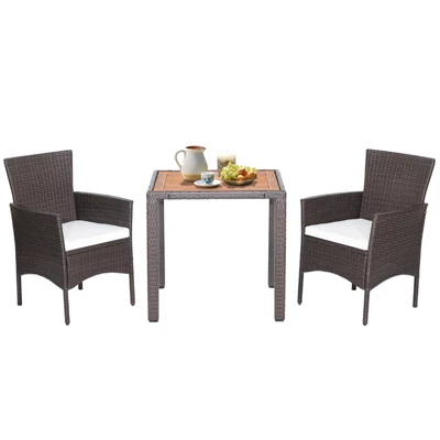 Enhance your dining experience with this exquisite 3-piece patio dining set! The set comprises two chairs made from long-lasting rattan, complete with cozy cushions, and a spacious dining table. Whether you wish to unwind with friends or family, this patio set is the perfect choice. The ergonomic seats and elastic cushions ensure maximum comfort, and the removable and washable cushion covers add convenience. Additionally, the dining table features a 28″ x 24″ (L x W) acacia wood tabletop, providing ample space for tableware, beverage, magazines, and more. When you are done dining, you can easily tuck the chairs under the table to save space.