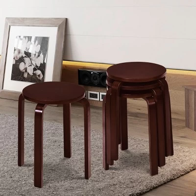 Our wooden dining stools are made of high quality bent wood, which is durable and sturdy, ensuing you a longer service time.The stackable design makes it very space-saving. You can stack 4 stools together in one corner to save space when not in use. The 4 legs and the stool are connected by X-shaped structure and thick metal screws to provide a greater weight capacity. Each leg has non-marking feet mats that can prevent the floor from scratching and increase the stability. It is a great choice for classroom, home and office.
