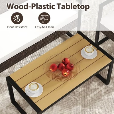- Stylish & Functional Table: Accompanied by a rectangular coffee table, the outdoor conversation set provides an ideal place for drinks and snacks. The wood-plastic tabletop is both heat-resistant and easy-to-clean, making it well-suited for the outdoor environment.