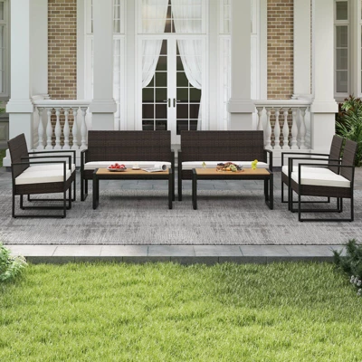 Experience outdoor living redefined with our 8 pieces patio furniture set!This outdoor furniture set comprises 4 armchairs, 2 loveseat, and 2 coffee table, featuring versatile layouts for various outdoor settings from your garden to poolside. Constructed with hand-woven PE rattan, the outdoor chairs and loveseat offers both exceptional durability and an aesthetically pleasing look. The coffee table with a wood-plastic top holds drinks and snacks within reach. Comfort is paramount with this patio conversation set, which includes cushions stuffed with soft sponge and outfitted with removable, washable covers to maintain freshness and comfort.